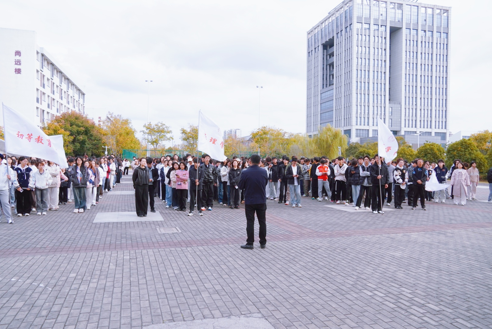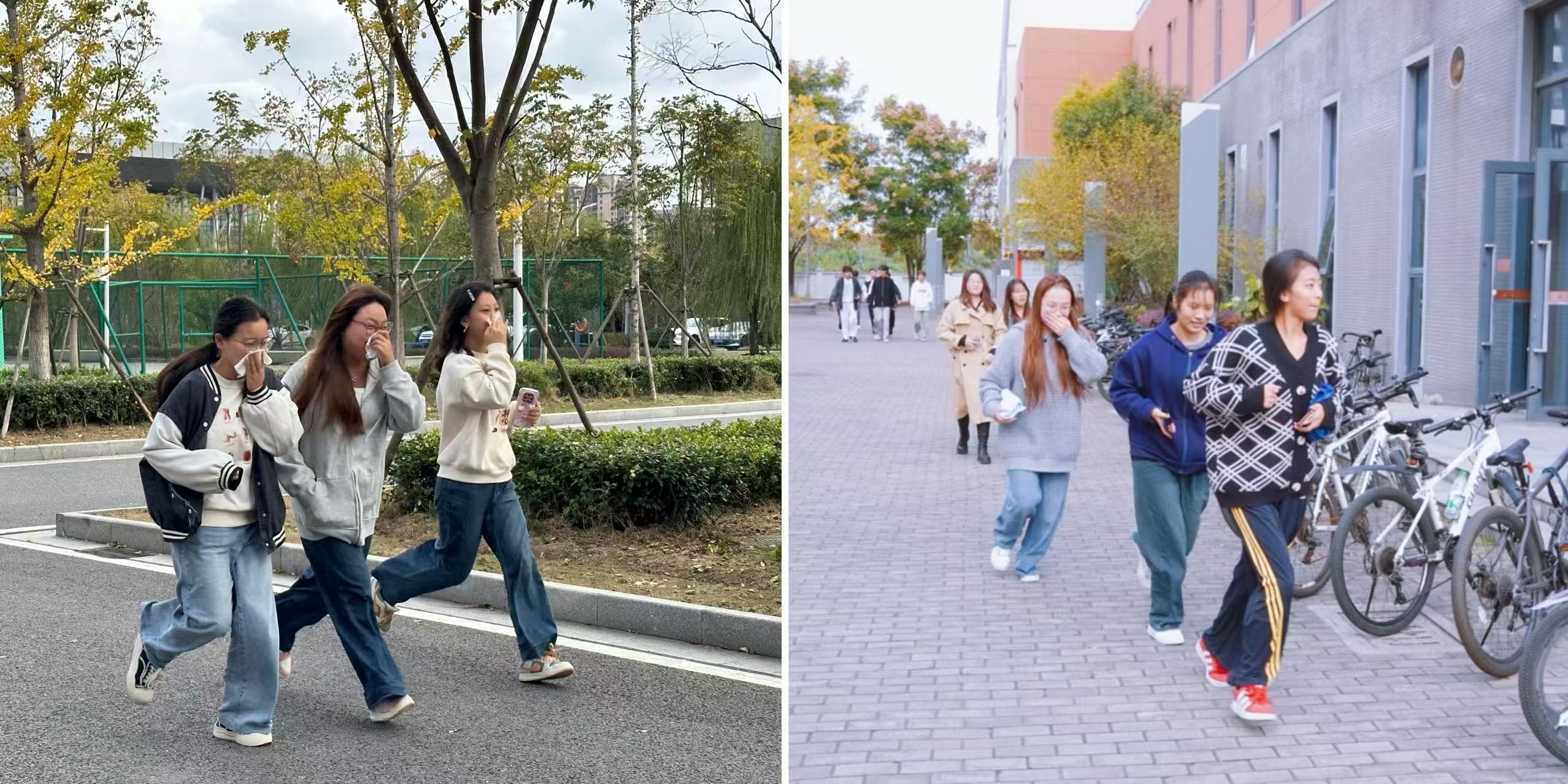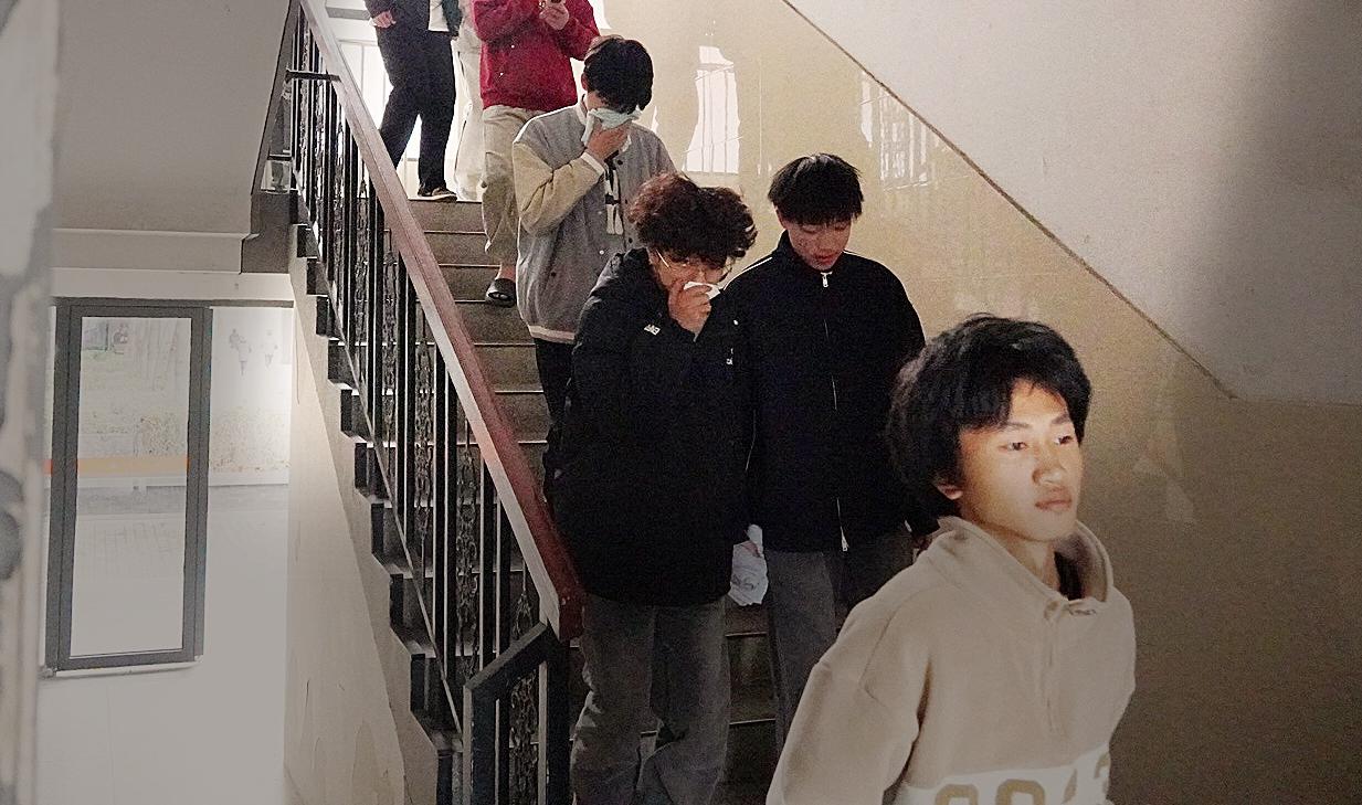 演练过程中同学们在楼层疏导员的指引下,迅速用湿毛巾捂住口鼻,秩序井然地撤离,仅用5分钟,全体参演师生已安全抵达食堂广场集合点,并在指定区域完成整队报备。
